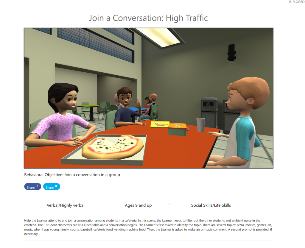 不少家長也消耗大量時間精力在教導自閉症兒童各種社交技巧,VR虛擬實境器價格大幅下降,以虛擬實境作教育工具的成本大降。Floreo已開發出超過200套虛擬實境課程,教導日常社交技巧和行為,例如街上橫過馬路,學校內食堂就座和溝通技巧等。