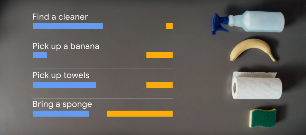 例如研究人員向機械人說:「我剛弄洒了咖啡,可以幫忙找東西清潔?」機械人馬上分析「弄洒了咖啡」代表的意思,權衡各種處理方法,經算法計算機率,決定去廚房找一塊海綿執行清潔任務。