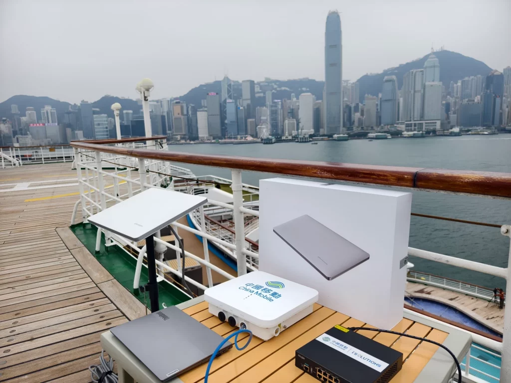 鼓浪嶼號郵輪船尾甲板,測試「千帆星座」低軌寬頻信號連接中國移動香港雲 Wi-Fi平台,為搭客提供寬頻上網。